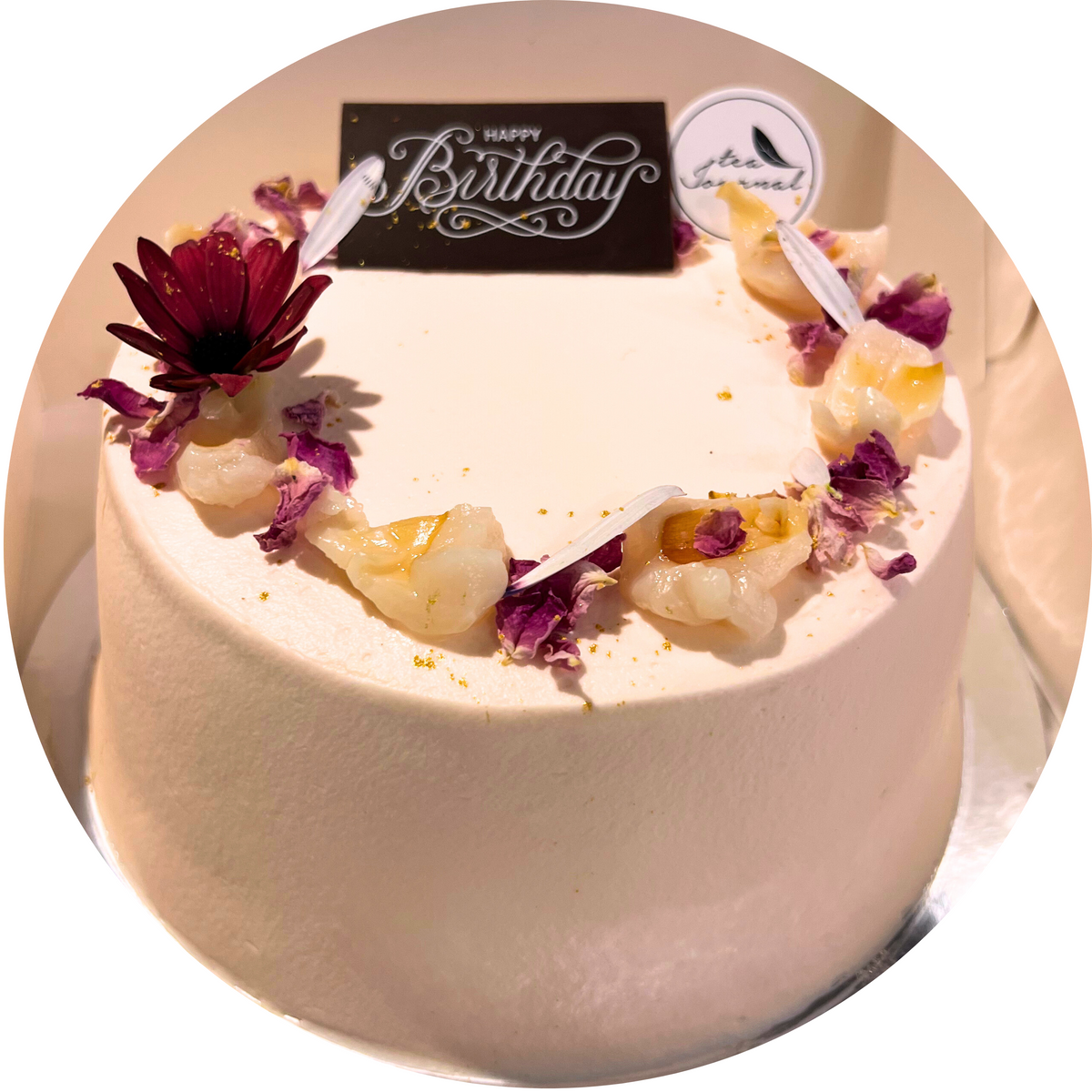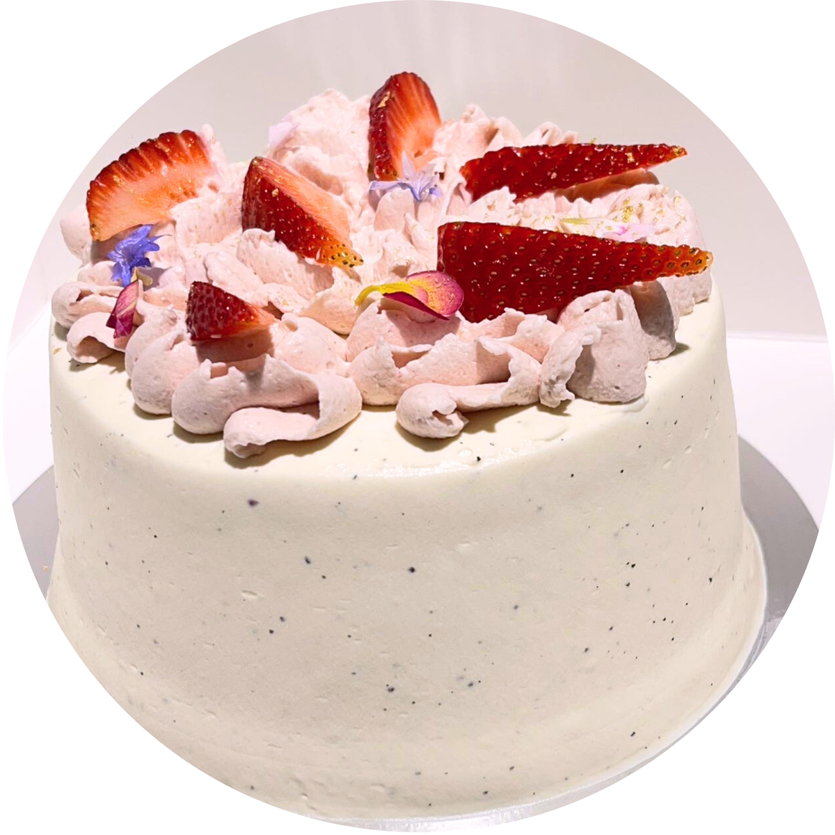 A balance between Lychee and Rose, an elegant and super fluffy chiffon. Topped with Lychees, freeze dried Lychees and Rose petals.